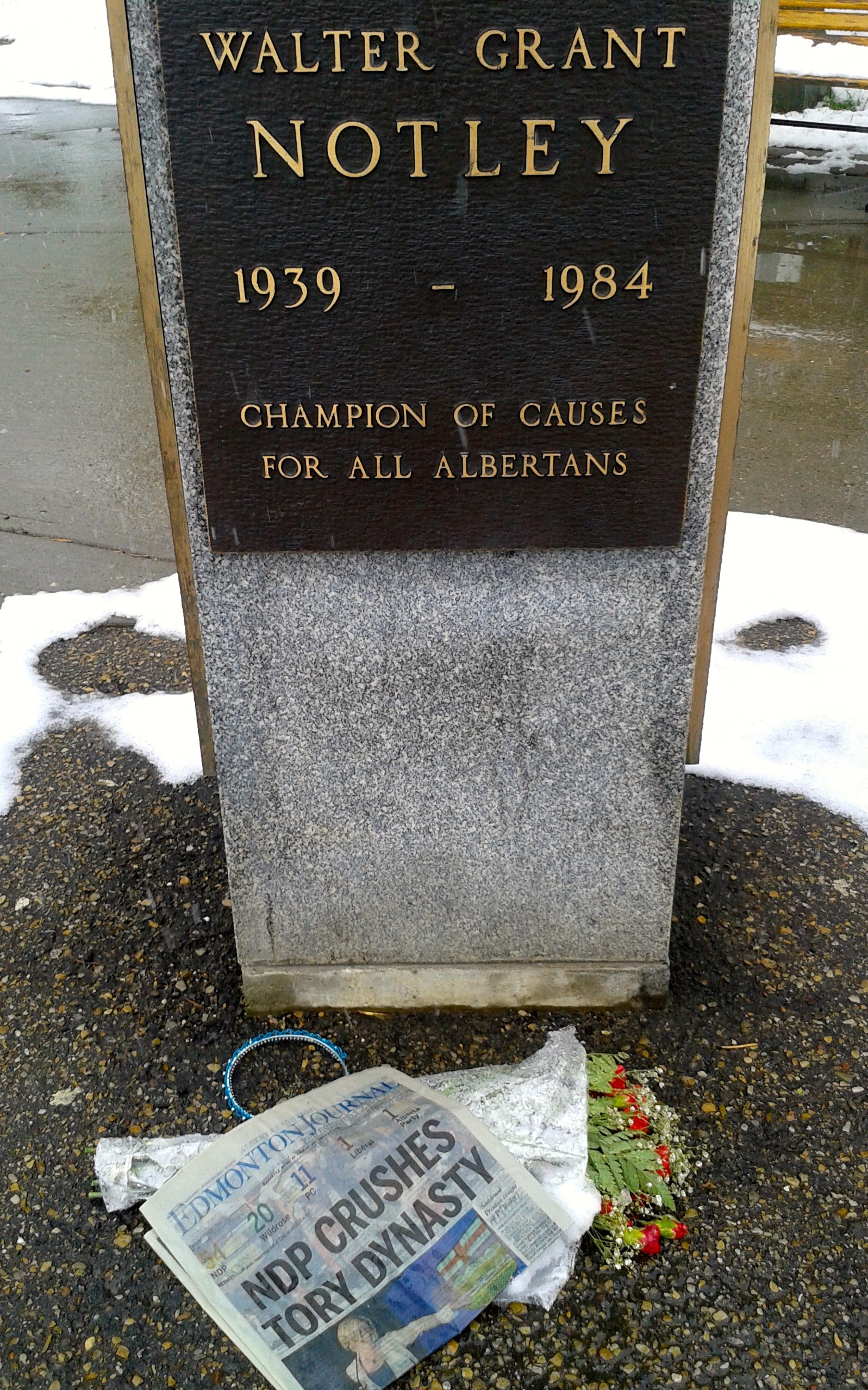 A poignant photo: Grant Notley Park in Edmonton; 6 May 2015, the day after the Provincial Election. The newspaper headline tells it all. Click to enlarge. [Photo by former NDP MLA Jim Gurnett]