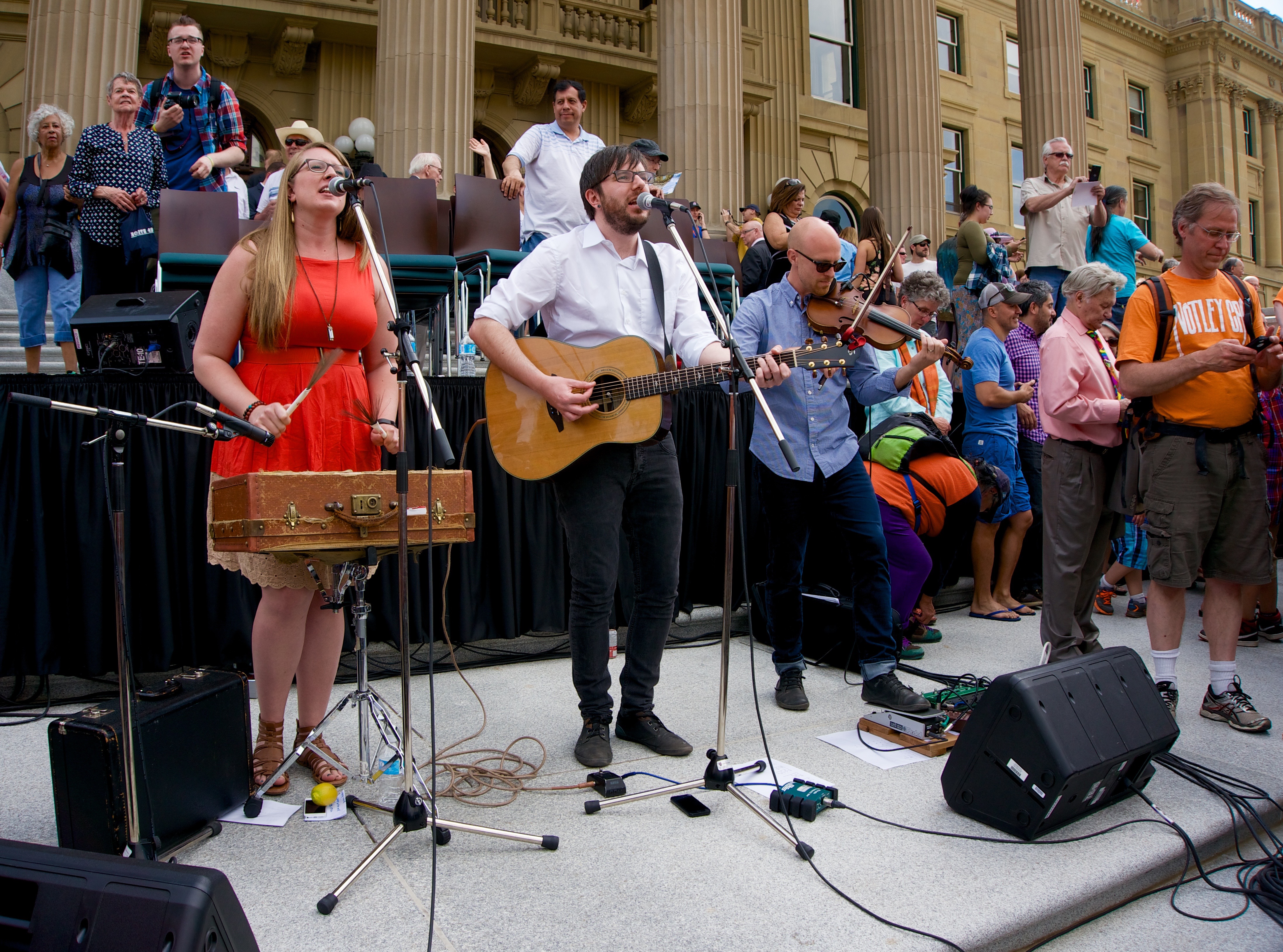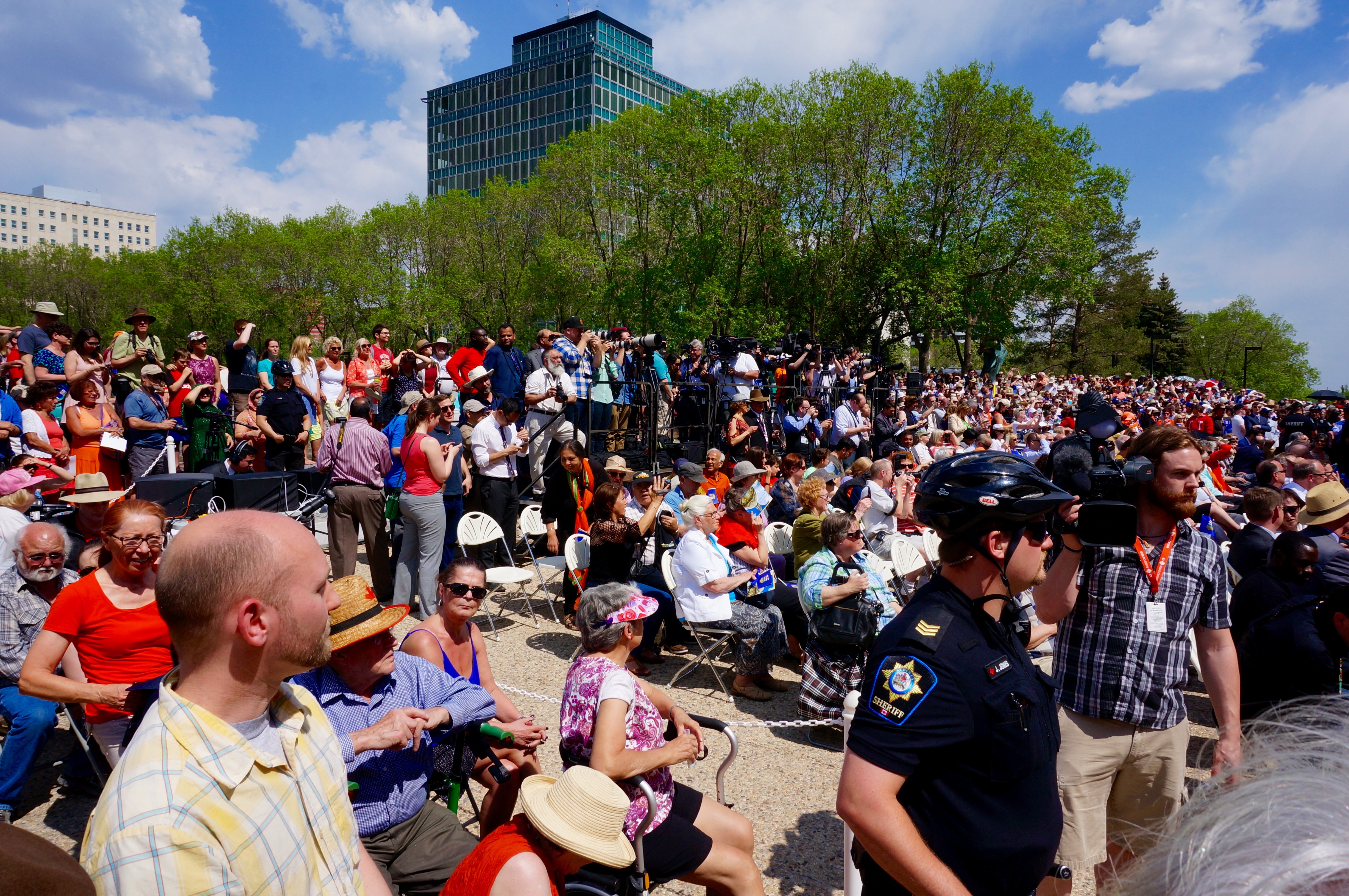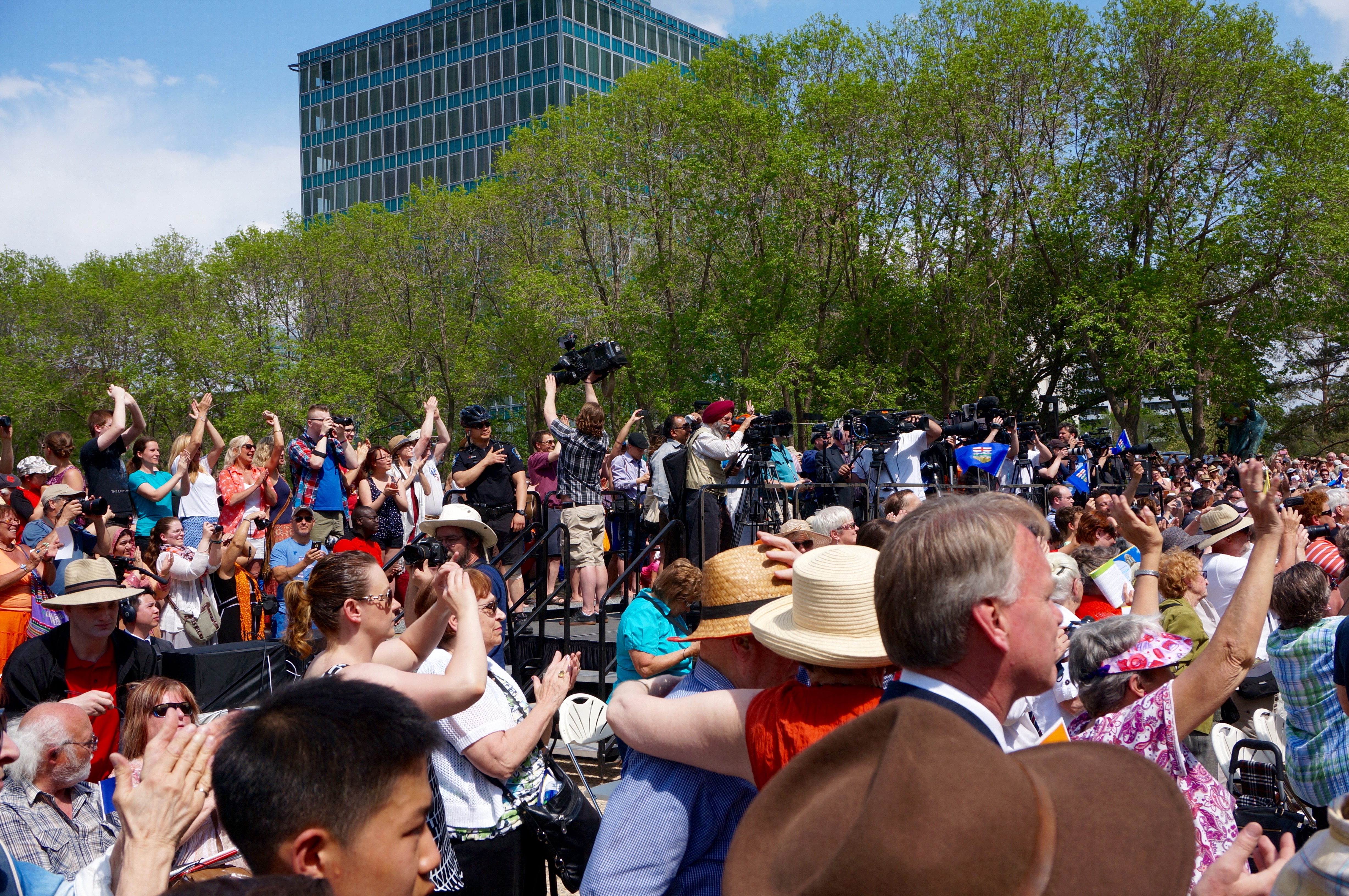 On a warm Sunday afternoon — 24th of May 2015 — on the steps of the sandstone Legislative Building in downtown Edmonton — Notley introduced her 11-member cabinet to a cheering crowd of more than 3,000.