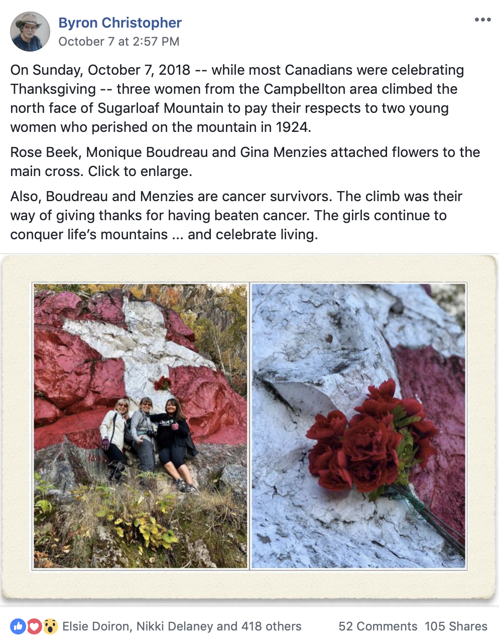 On Thanksgiving Day 2018 — when Canadians were in church or at home preparing a special meal, three women from the Campbellton, New Brunswick area set off to accomplish something they’d previously considered impossible: reach a pair of crosses on Sugarloaf Mountain.