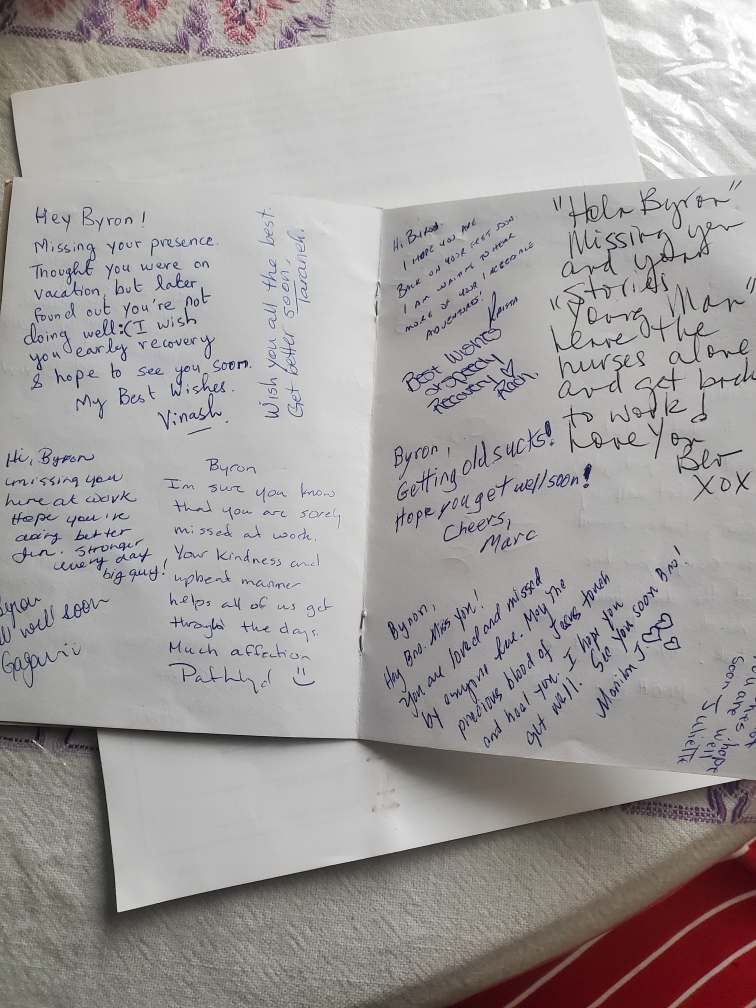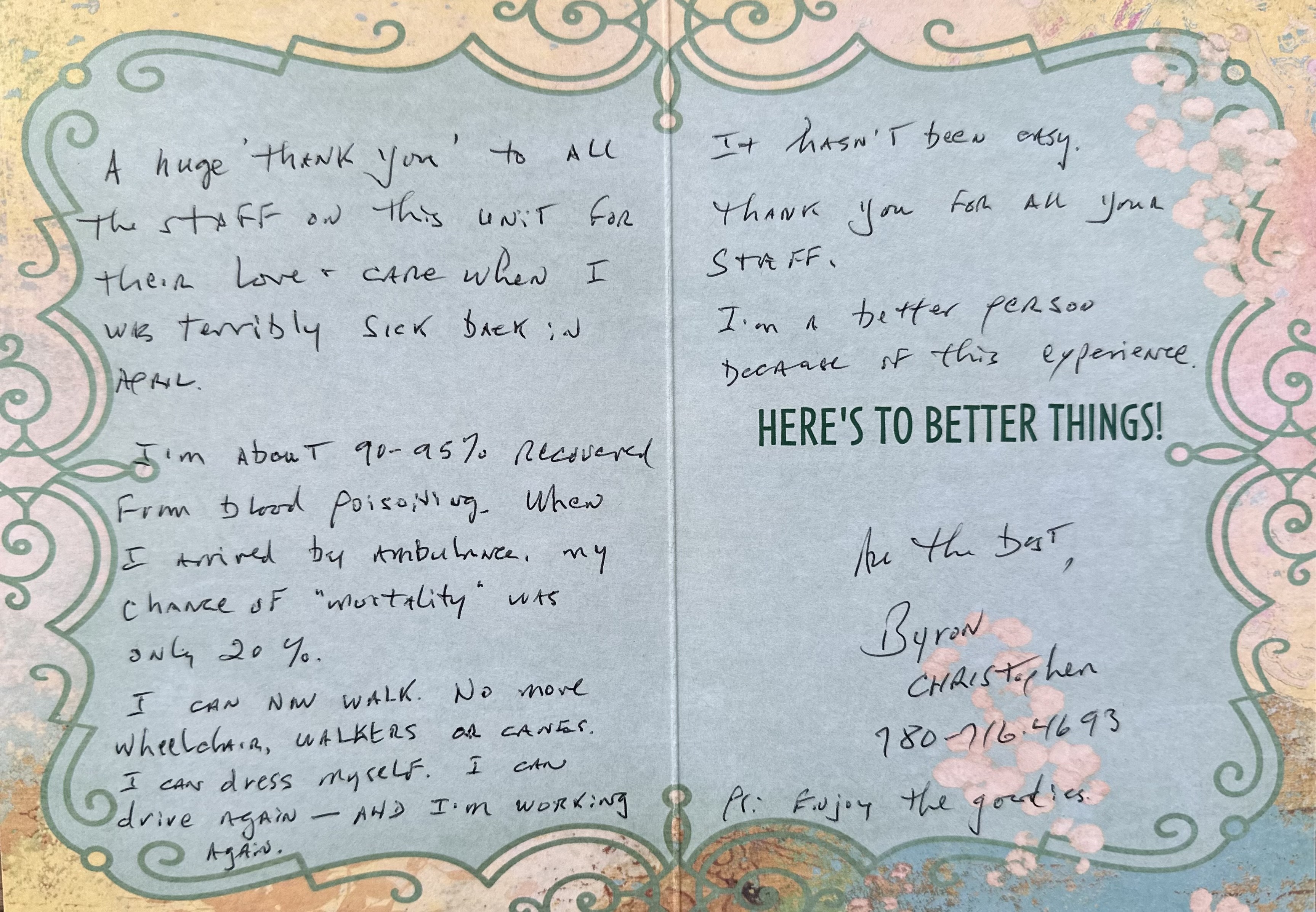 My penmanship is the pits, I know. Here’s a translation: “A huge ‘thank you’ to all the staff on this unit for their love and care when I was terribly sick back in April. I’m [now] about 90-95 percent recovered from blood poisoning. When I arrived by ambulance, my chance of ‘mortality’ was 80 percent [CORRECTION]. I can now walk. No more wheelchair, walkers or canes. I can dress myself. I can drive again and I’m working again. It hasn’t been easy. Thank you to all your staff. I’m a better person because of this experience. All the best. Byron Christopher. 780-716-4693. PS: Enjoy the goodies.”